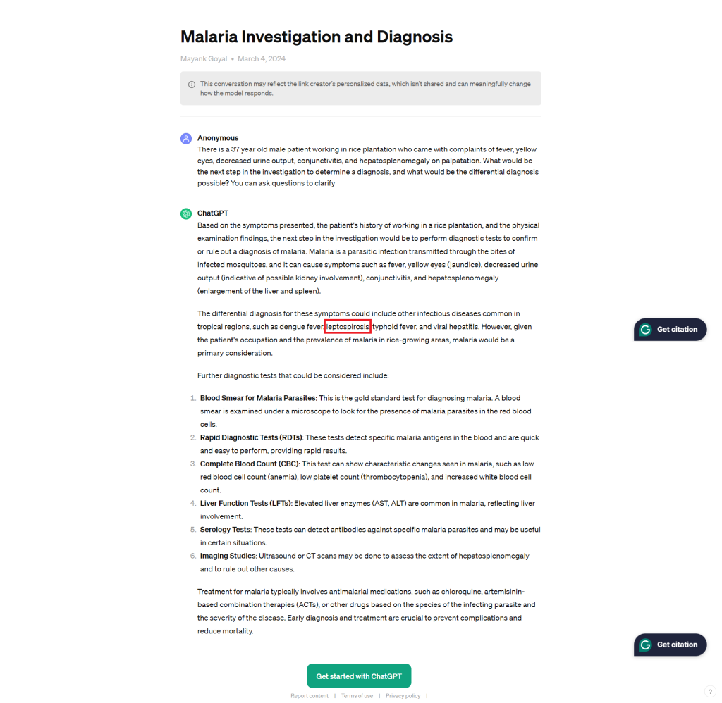 Prompt on 3th March, 2024: https://chat.openai.com/share/fee20070-ab8f-40b8-8a5d-92049c5a3ff1 (Leptospirosis was the correct differential diagnosis, according to the doctor)
